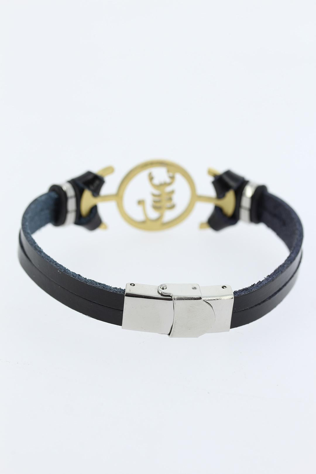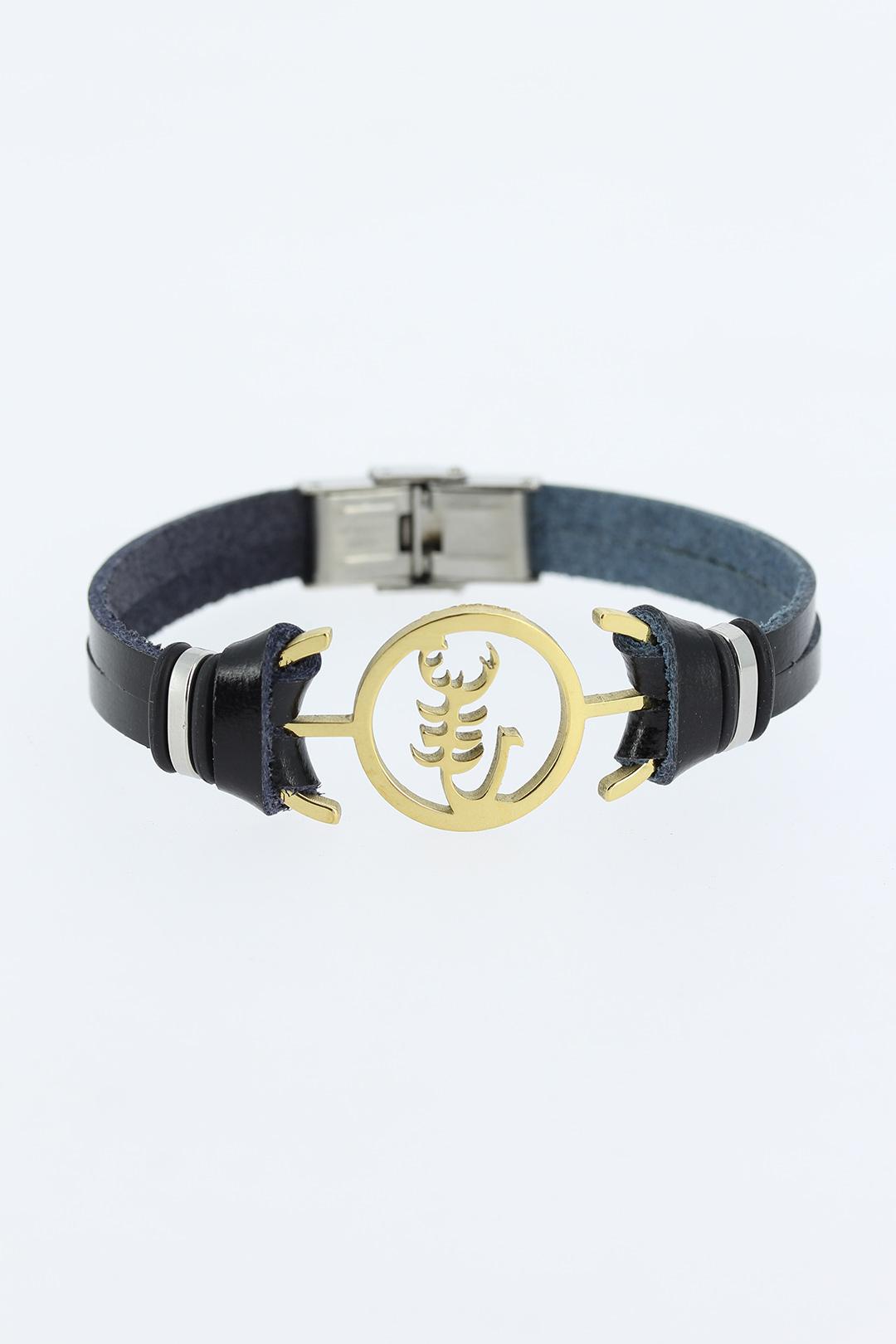 Gold Renk Çelik Akrep Figürlü Metal Aksesuarlı Siyah Renk Deri Erkek Bileklik