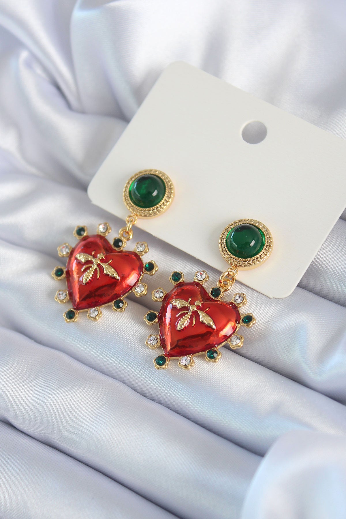 Gold Renk Kırmızı Kalp Model Zirkon Taş Detay Pirinç VİP Kadın Küpe