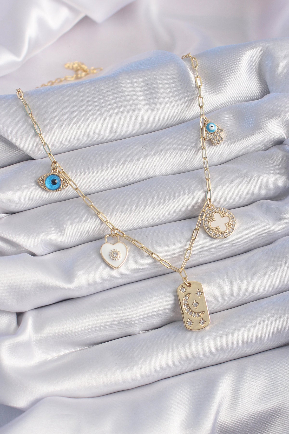 Gold Renk Zirkon Taşlı Çoklu Figür Model Şans Kolyesi