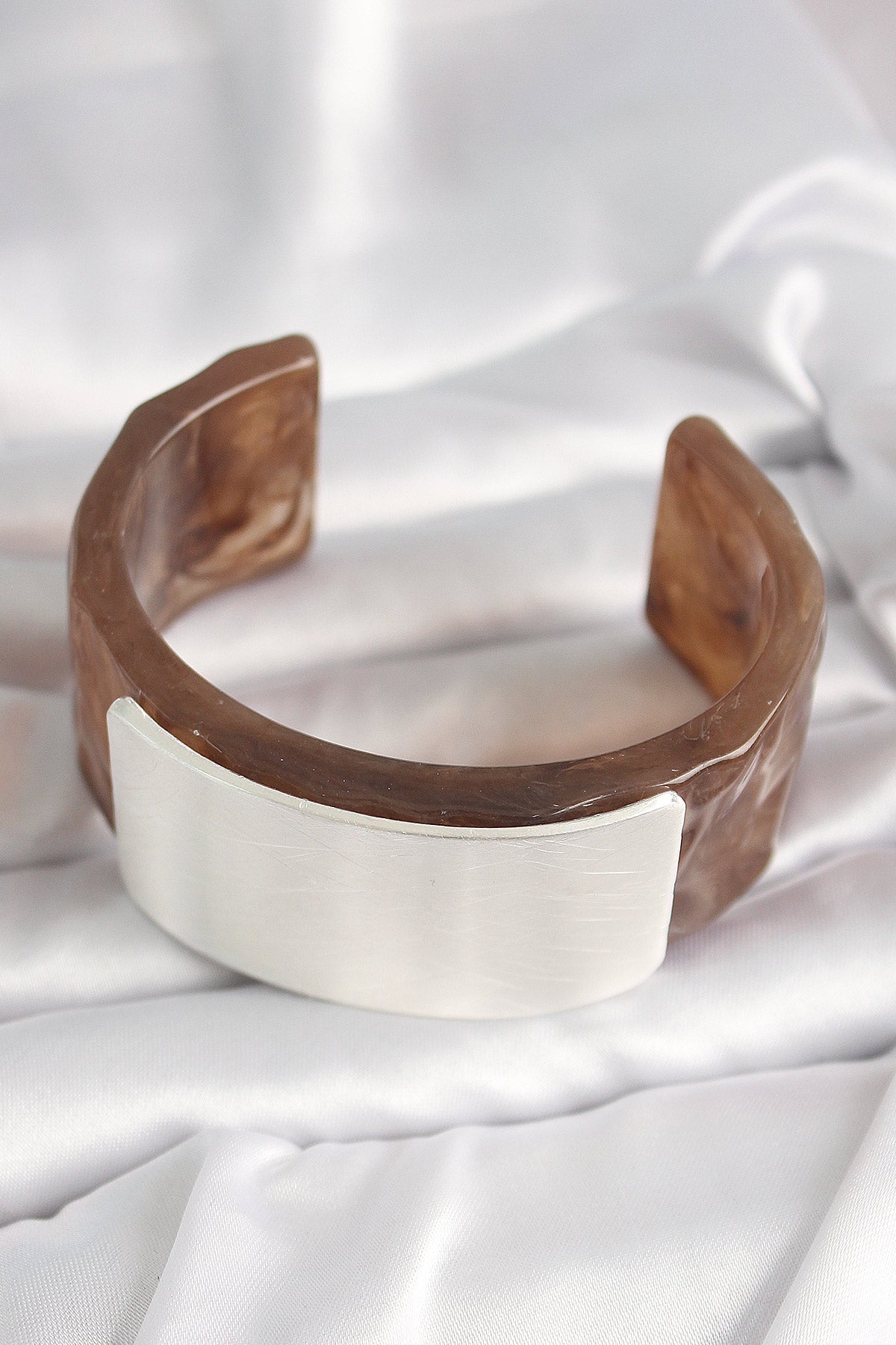 Kahverengi Mermer Desen Akrilik Plastik Gümüş Dikdörtgen Plaka Vintage Kadın Bilezik