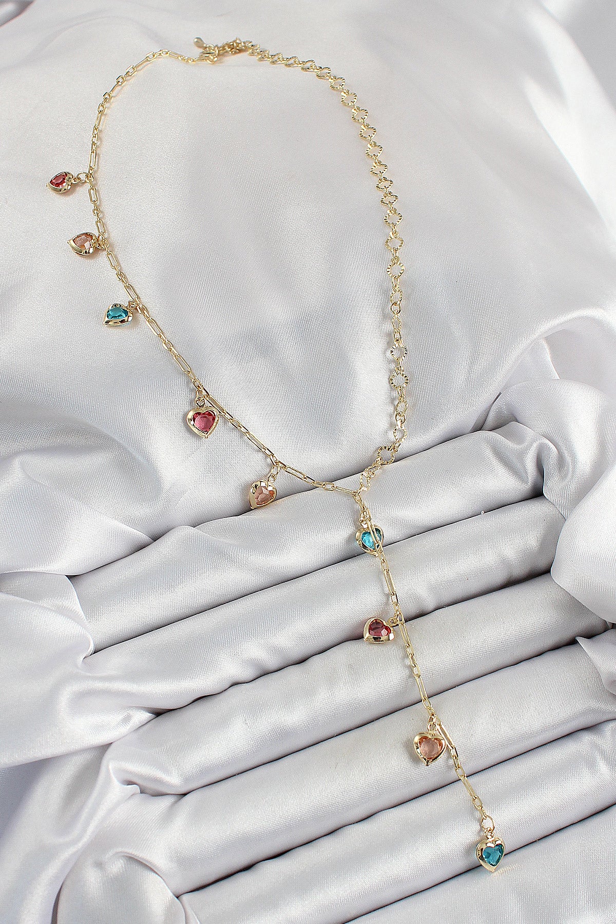 Pirinç Asorti Kalp Model Gold Renk Zirkon Taşlı Y Kolye