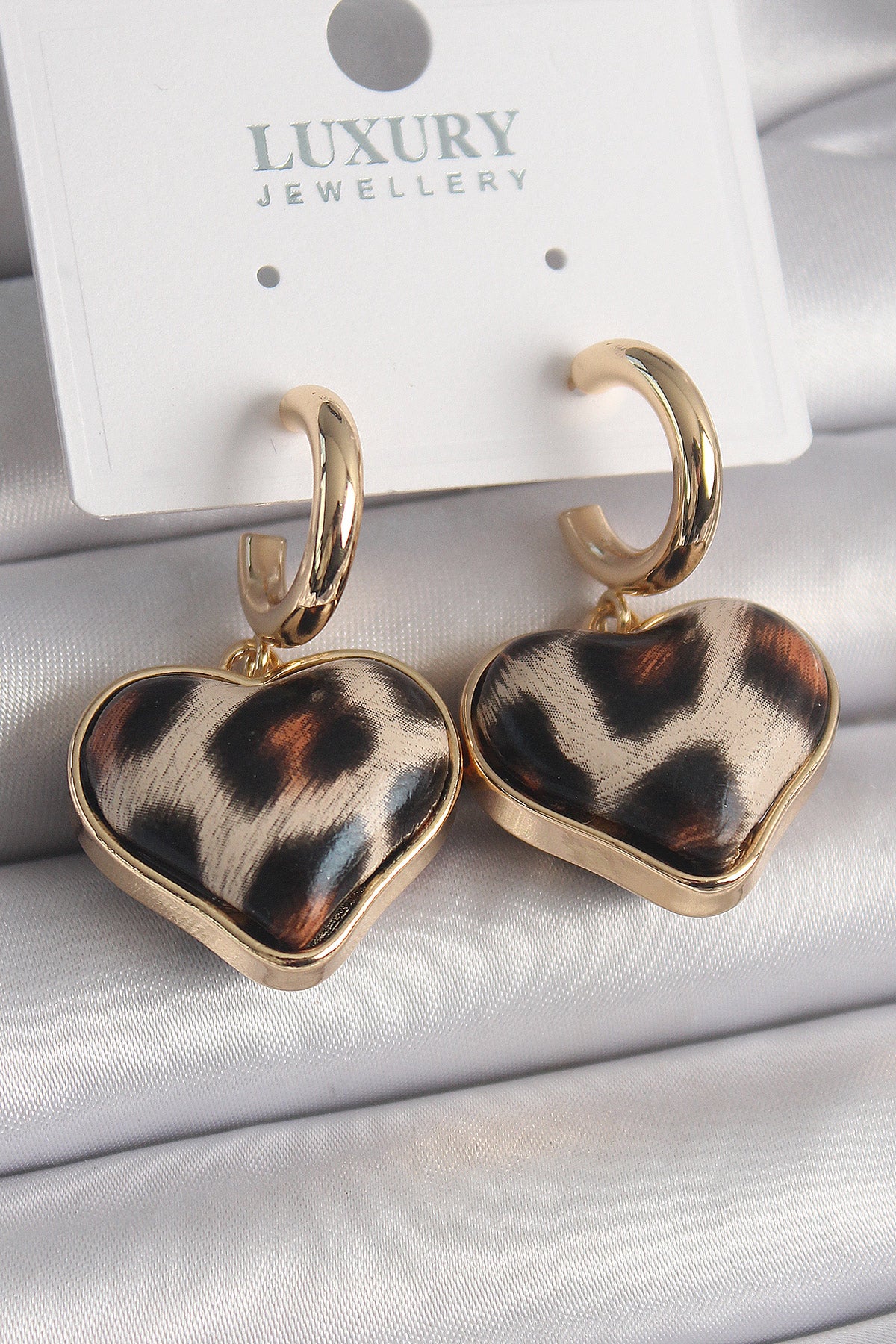 Pirinç Gold Renk 3D Kalp Leopar Model Kadın Küpe