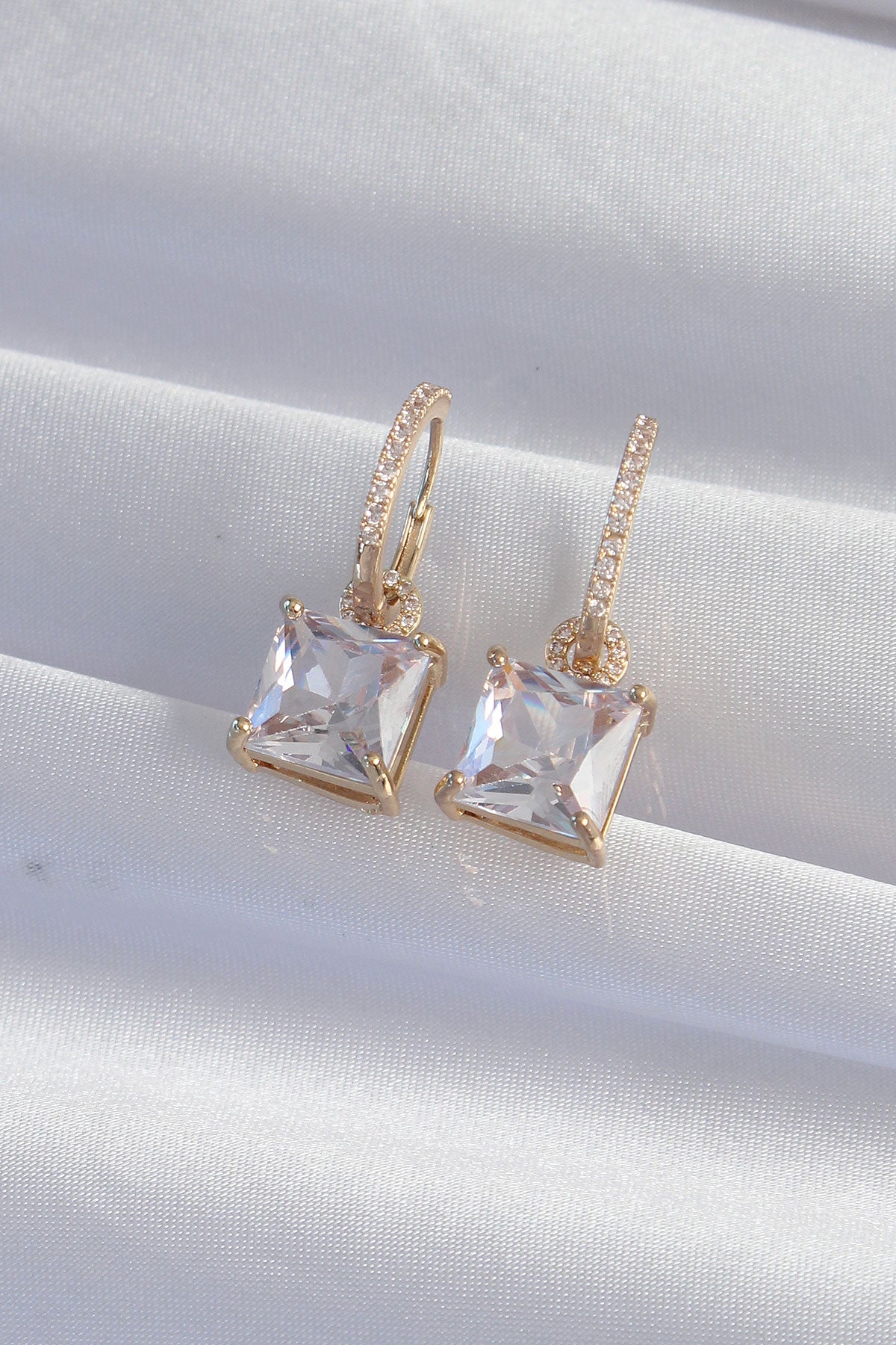 Pirinç Gold Renk Kare Zirkon Taşlı Halka Küpe