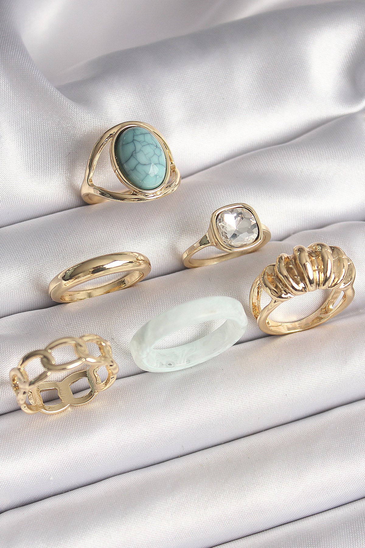 Pirinç Gold Renk Kare Zirkon Taşlı Sarmal Model Mavi Taş Detay 6'Lı Kadın Yüzük Seti