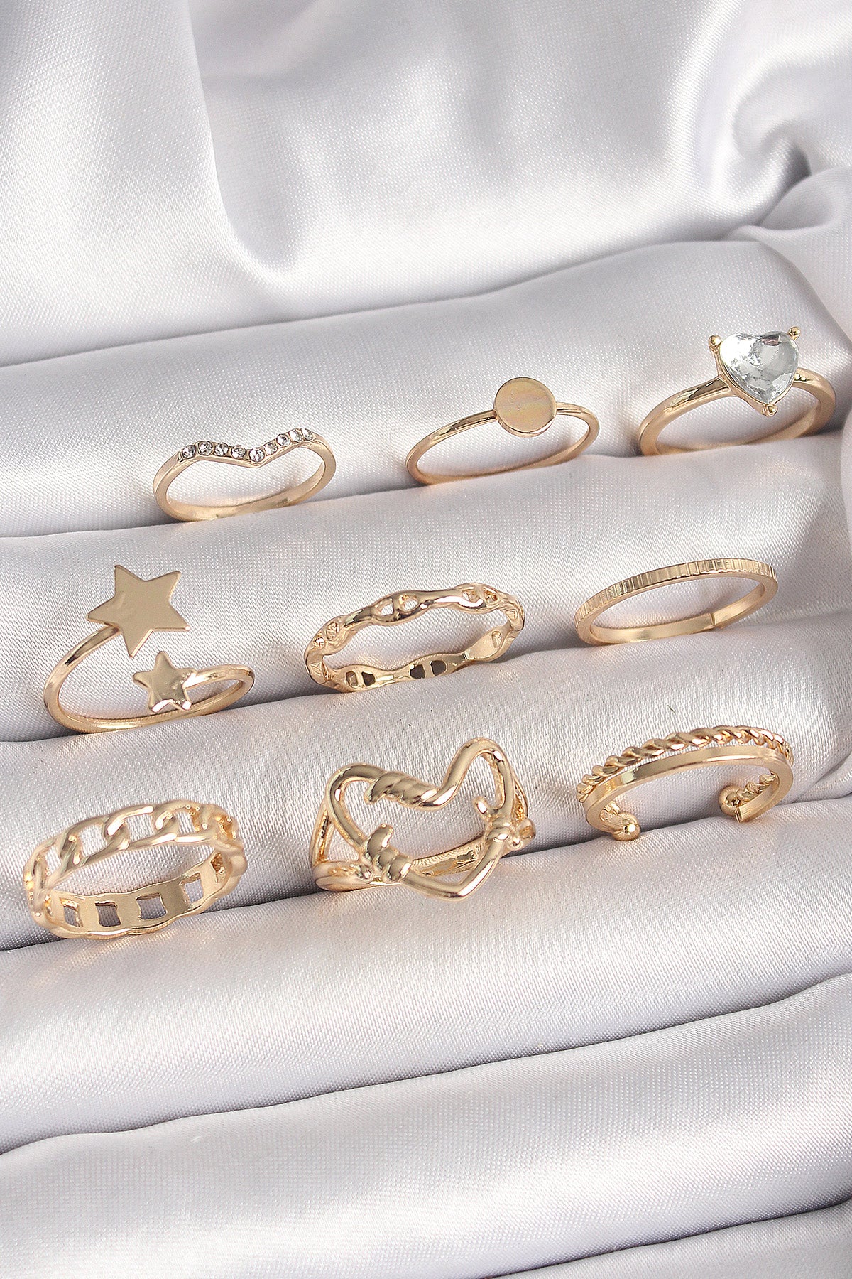 Pirinç Gold Renk Zirkon Taş Detaylı Kalp Yıldız Figür Kadın Yüzük Kombini