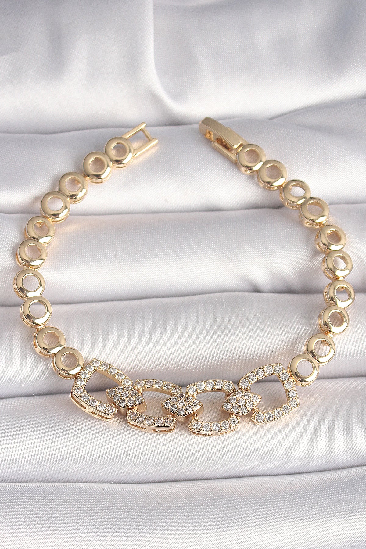 Pirinç Gold Renk Zirkon Taşlı Daire Zincir Model Kadın Bileklik