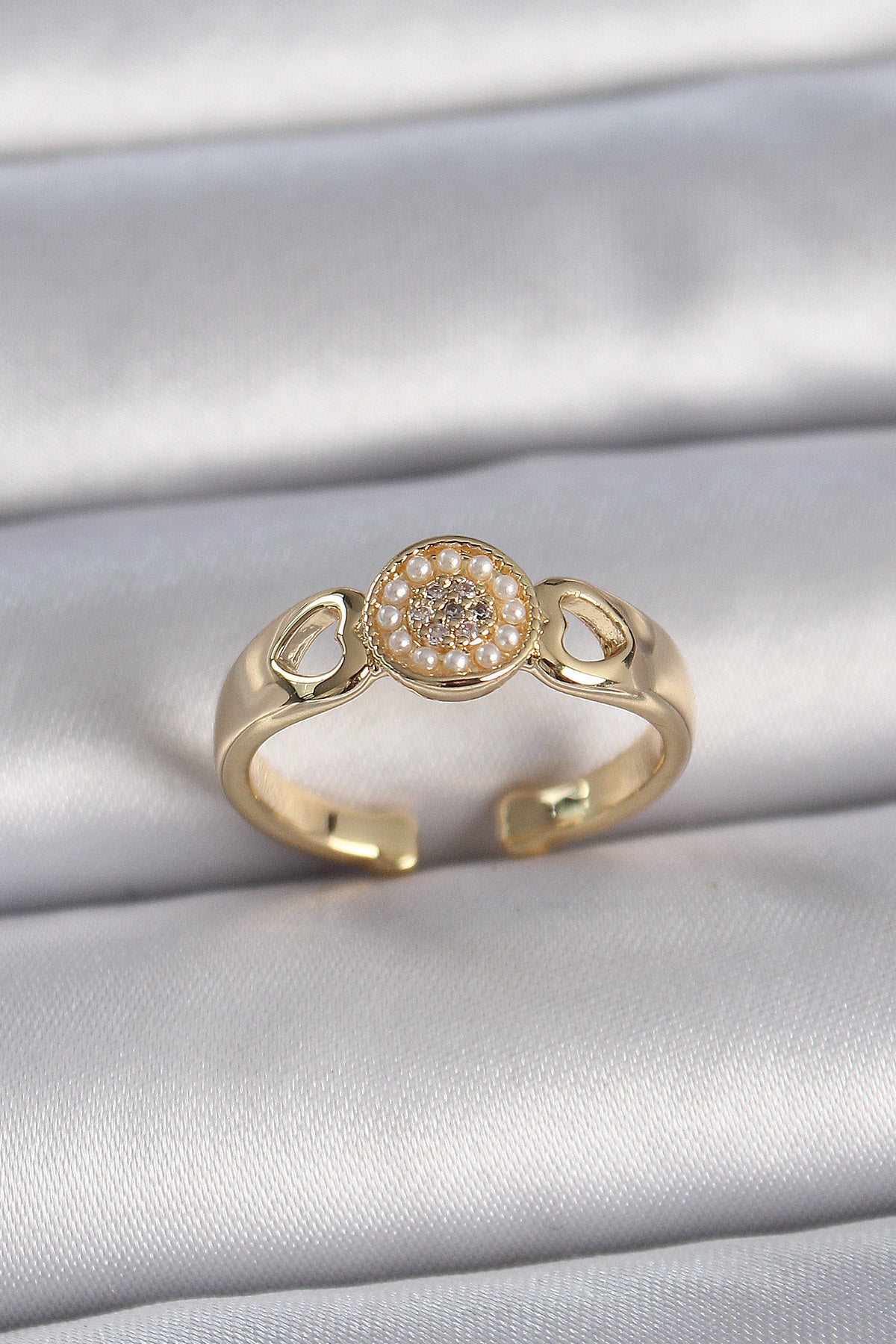 Pirinç Gold Renk Zirkon Taşlı İncili Kalp İşleme Detay Ayarlanabilir Kadın Yüzük