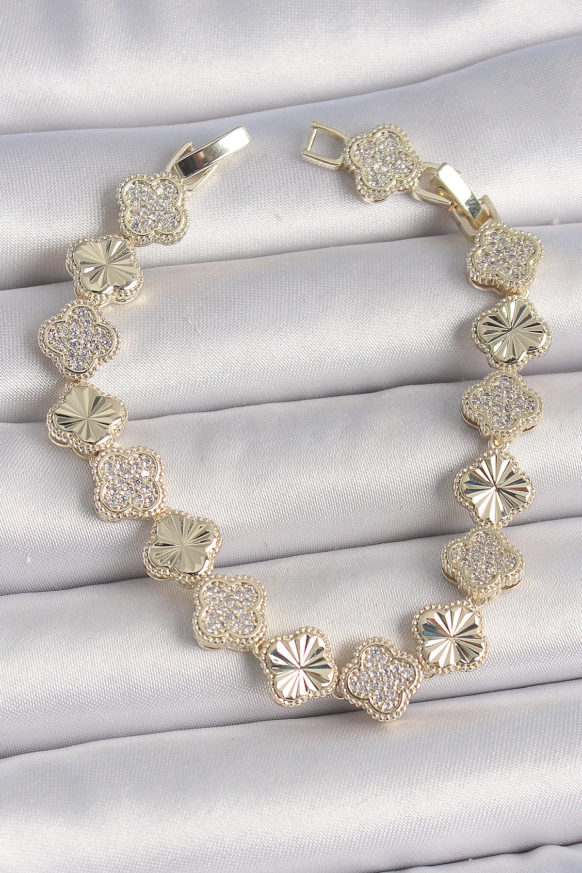 Pirinç Gold Renk Zirkon Taşlı İşlemeli Yonca Model VIP Seri Exculusive Kadın Bileklik