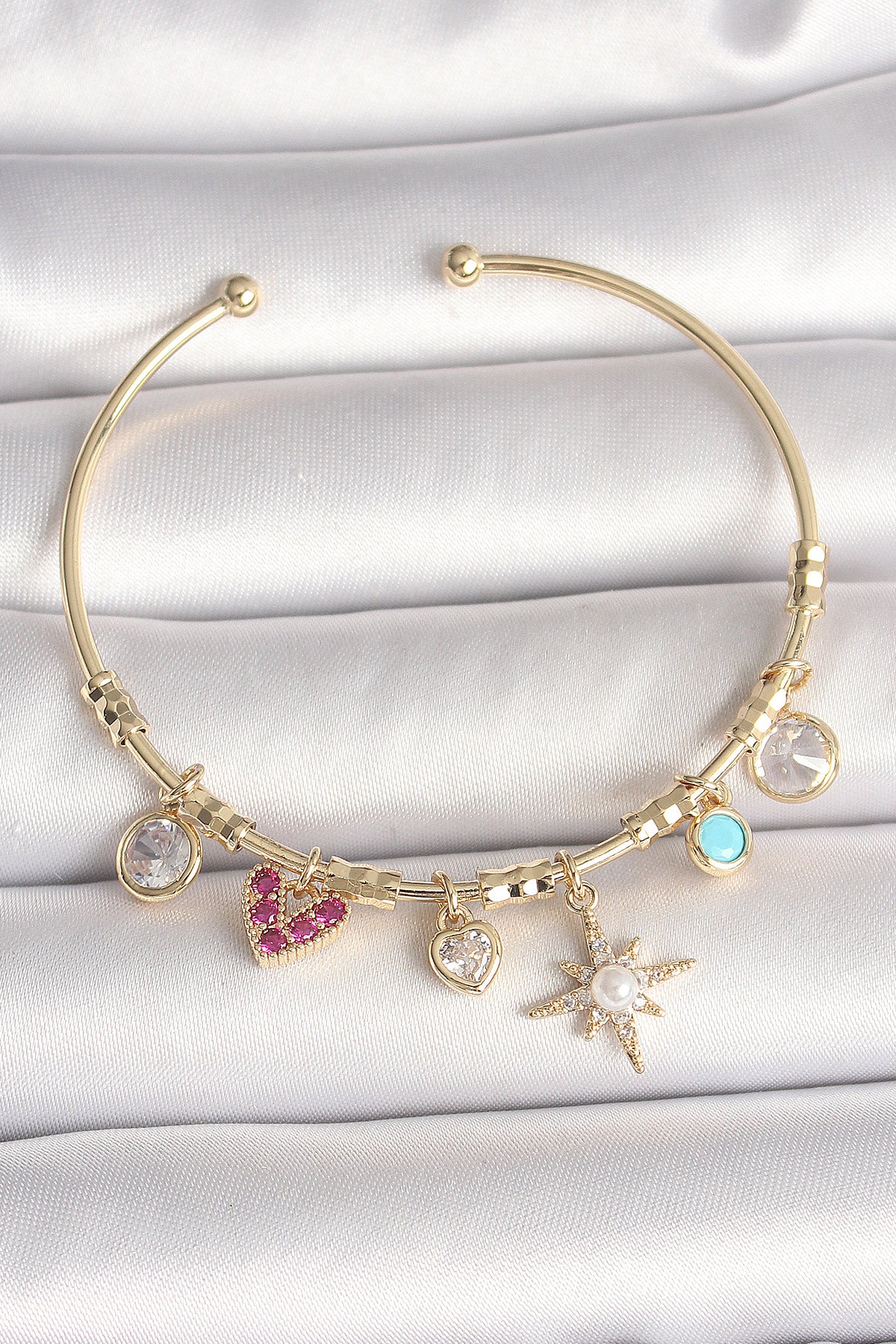 Pirinç Gold Renk Zirkon Taşlı Sallantı Kutup Yıldız Figür İnci Detay Charm Kadın Bileklik