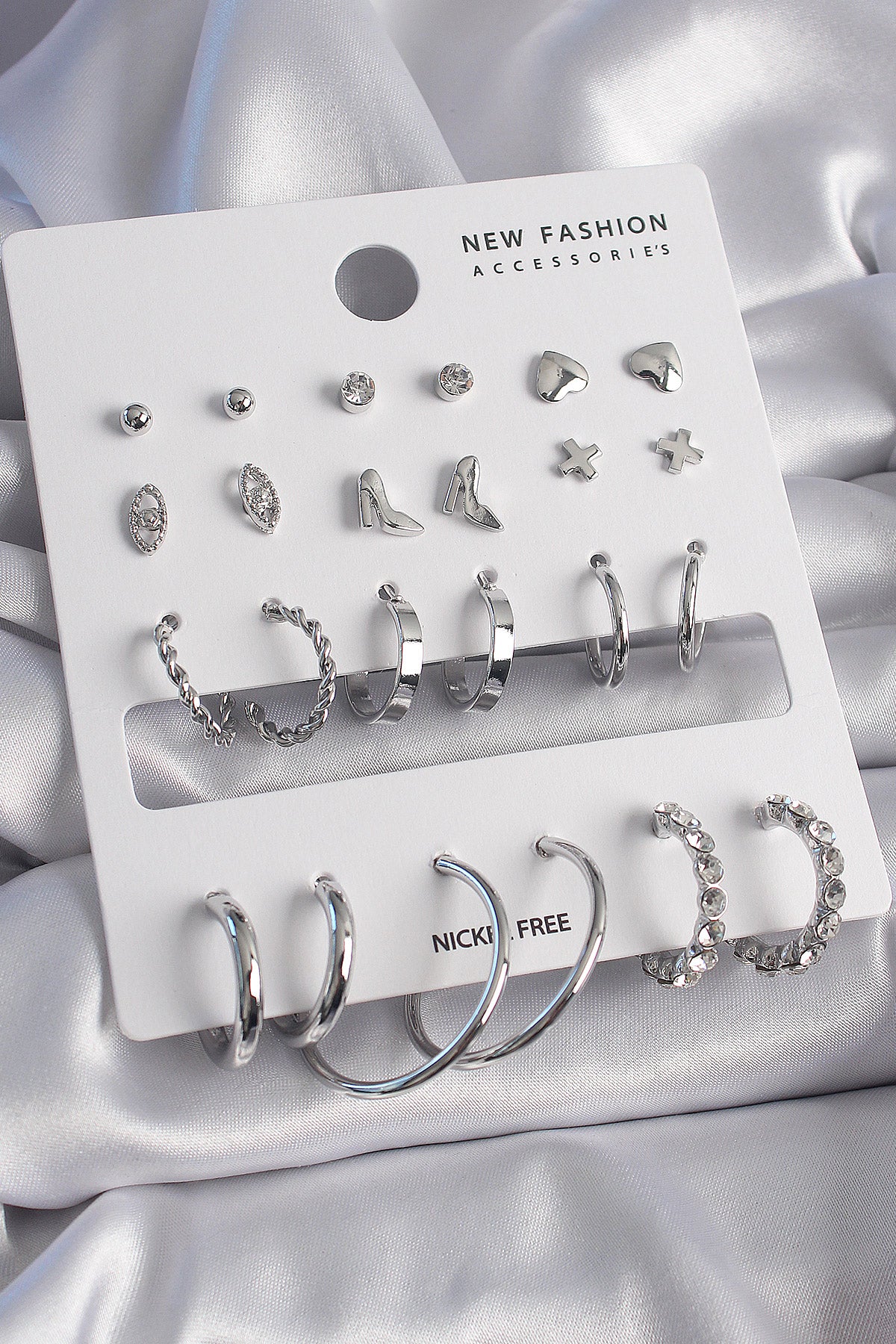 Pirinç Gümüş Renk 12 Çift Kadın Küpe Seti