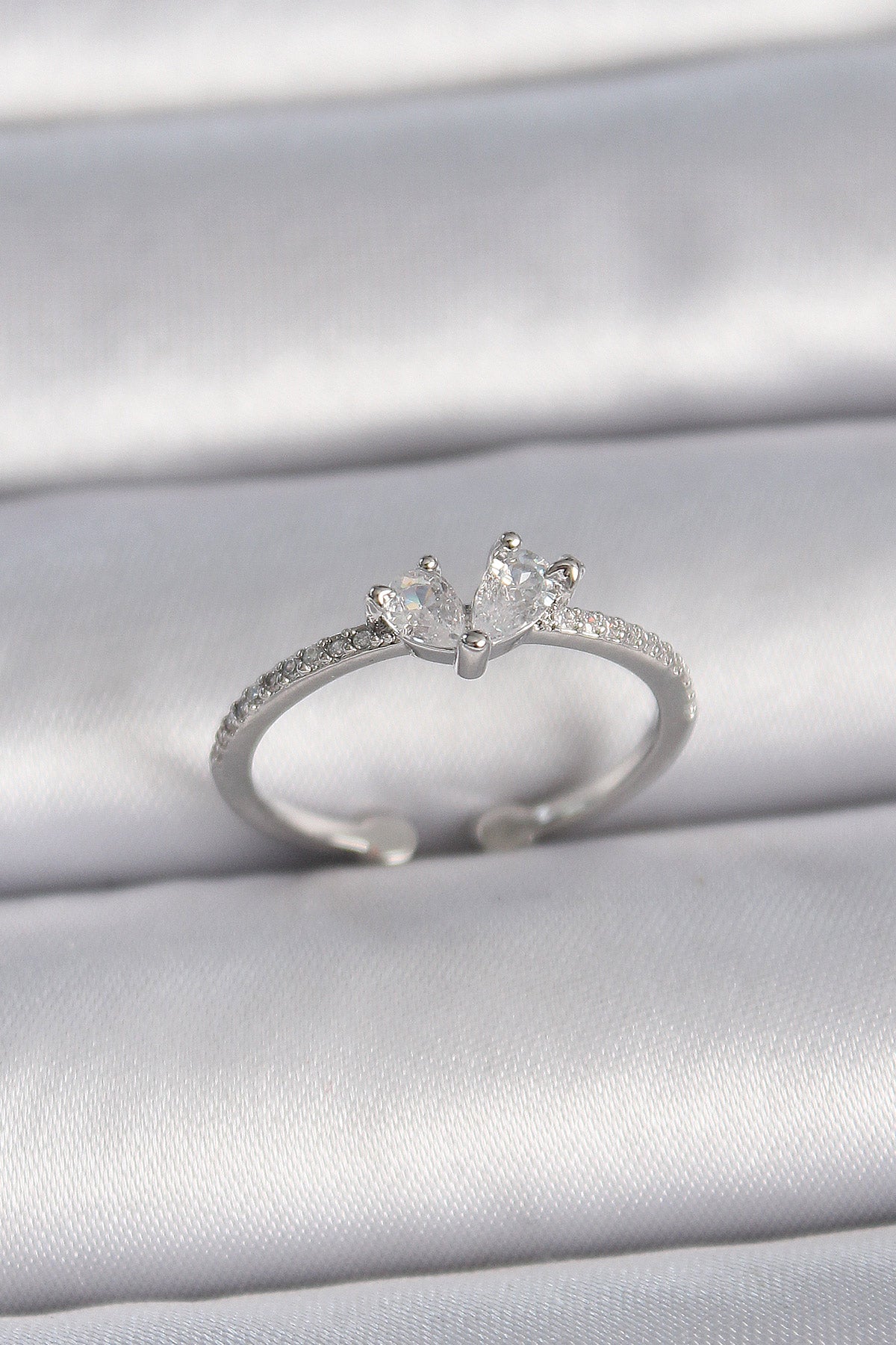 Pirinç Gümüş Renk Ayaralanabilir Zirkon Taşlı Kalp Model Kadın Yüzük