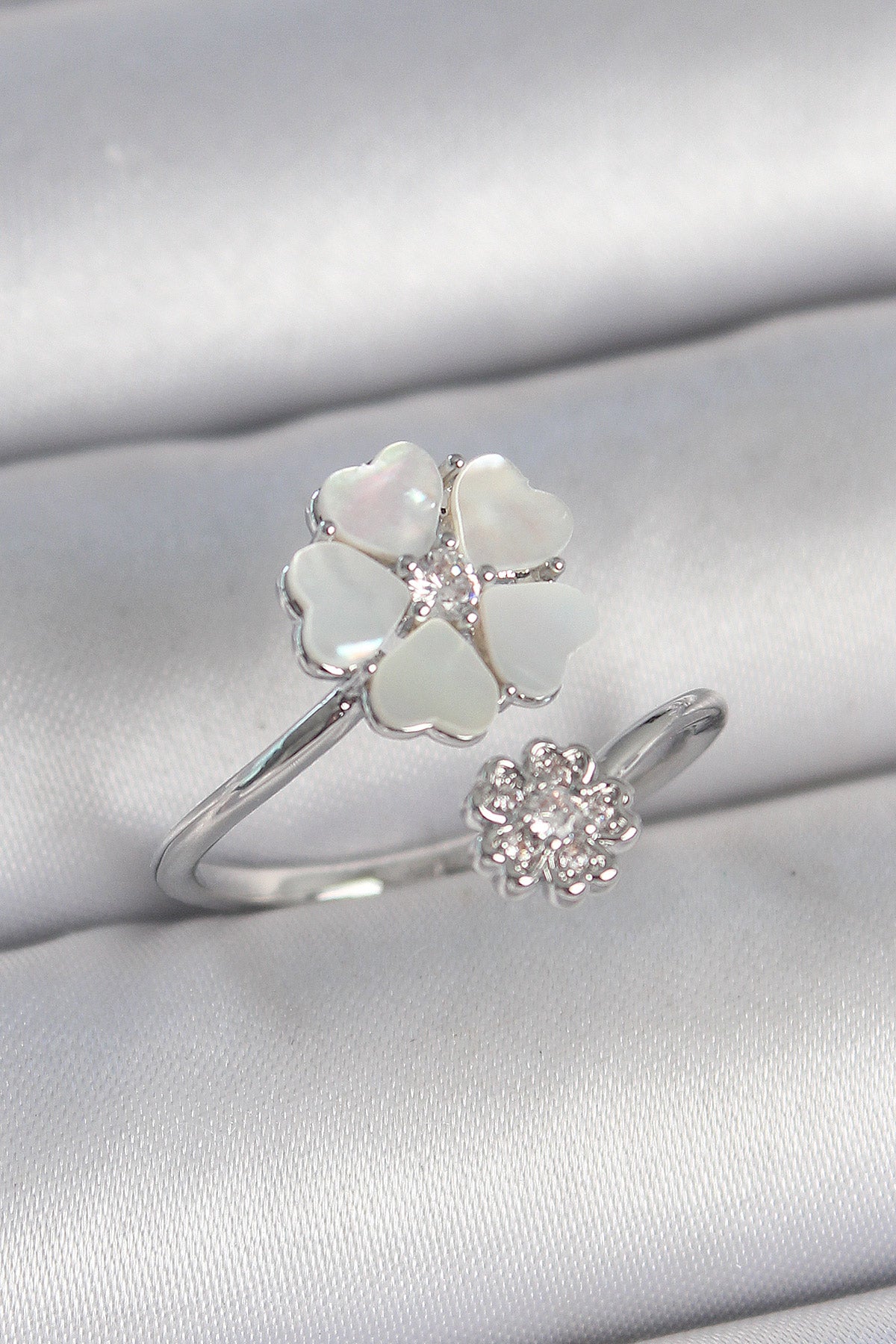 Pirinç Gümüş Renk Beyaz Mineli Çiçek Model Zirkon Taş Detay Kadın Yüzük