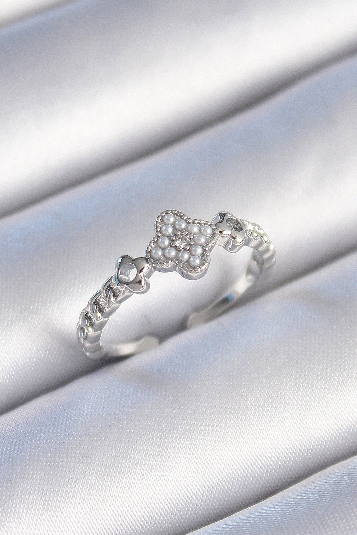 Pirinç Gümüş Renk İncili Yonca Model Zirkon Taş Detaylı Kadın Yüzük