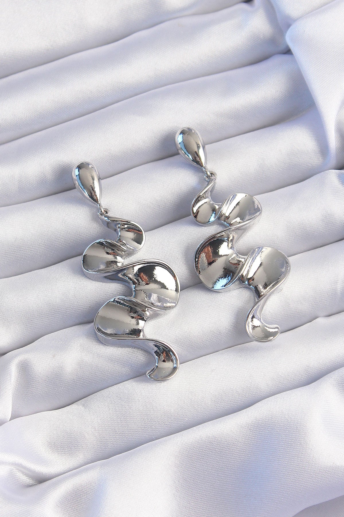 Pirinç Gümüş Renk Kıvrımlı Sallantılı Küpe