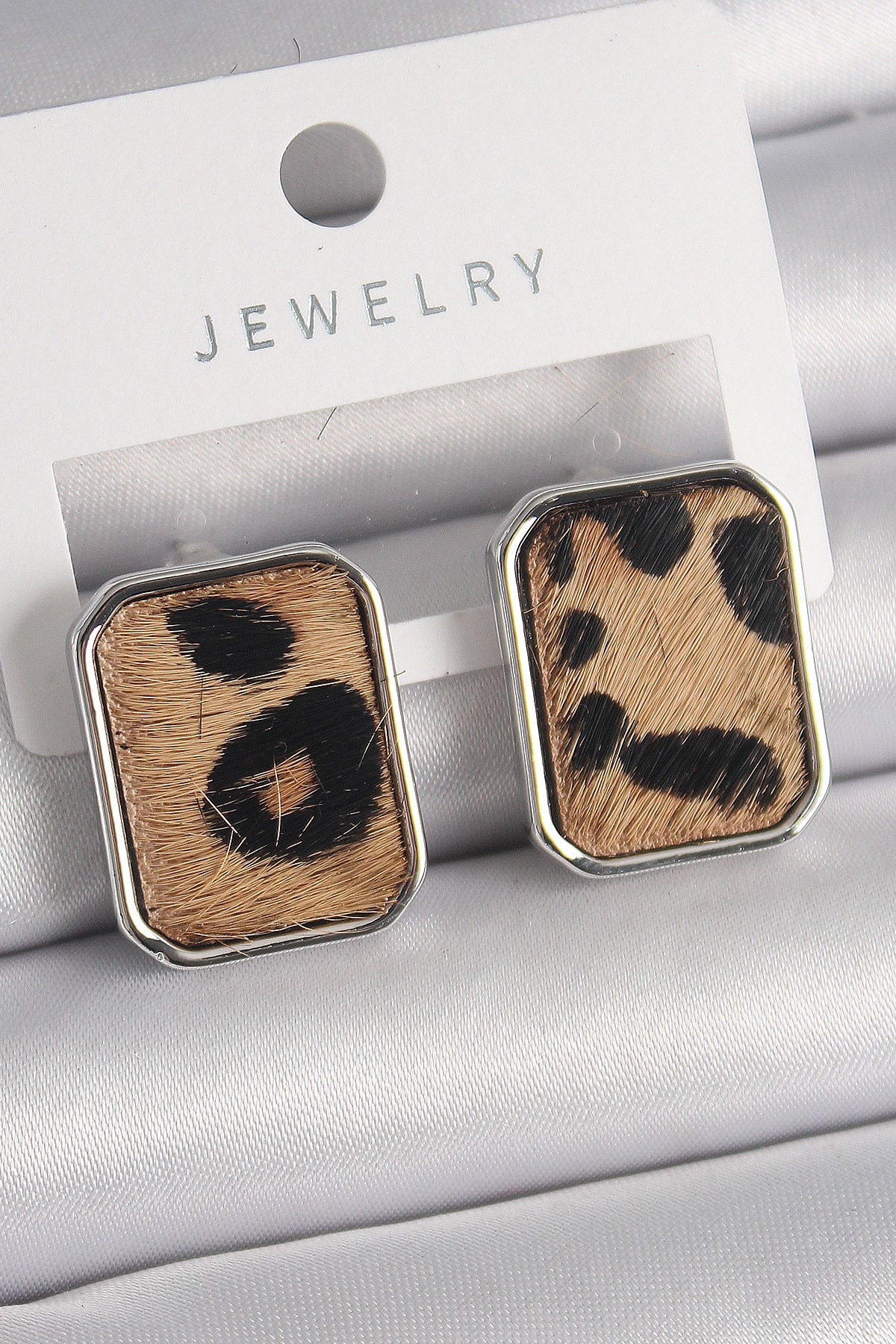 Pirinç Gümüş Renk Leopar Desenli Kare Model Kadın Küpe