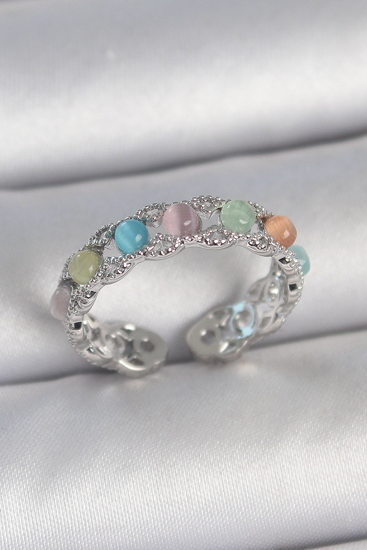 Pirinç Gümüş Renk Renkli Mineli Ayarlanabilir Kadın Yüzük