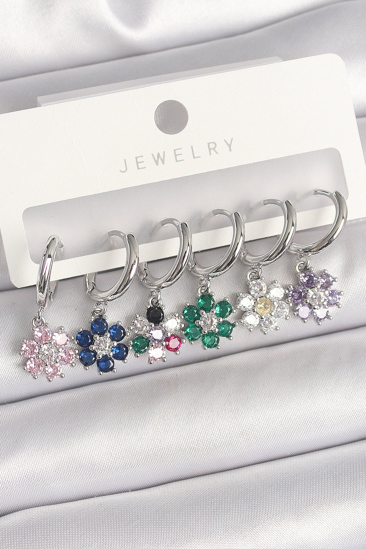 Pirinç Gümüş Renk Sallantı Renkli Zirkon Taşlı Çiçek Model Kadın Küpe Seti