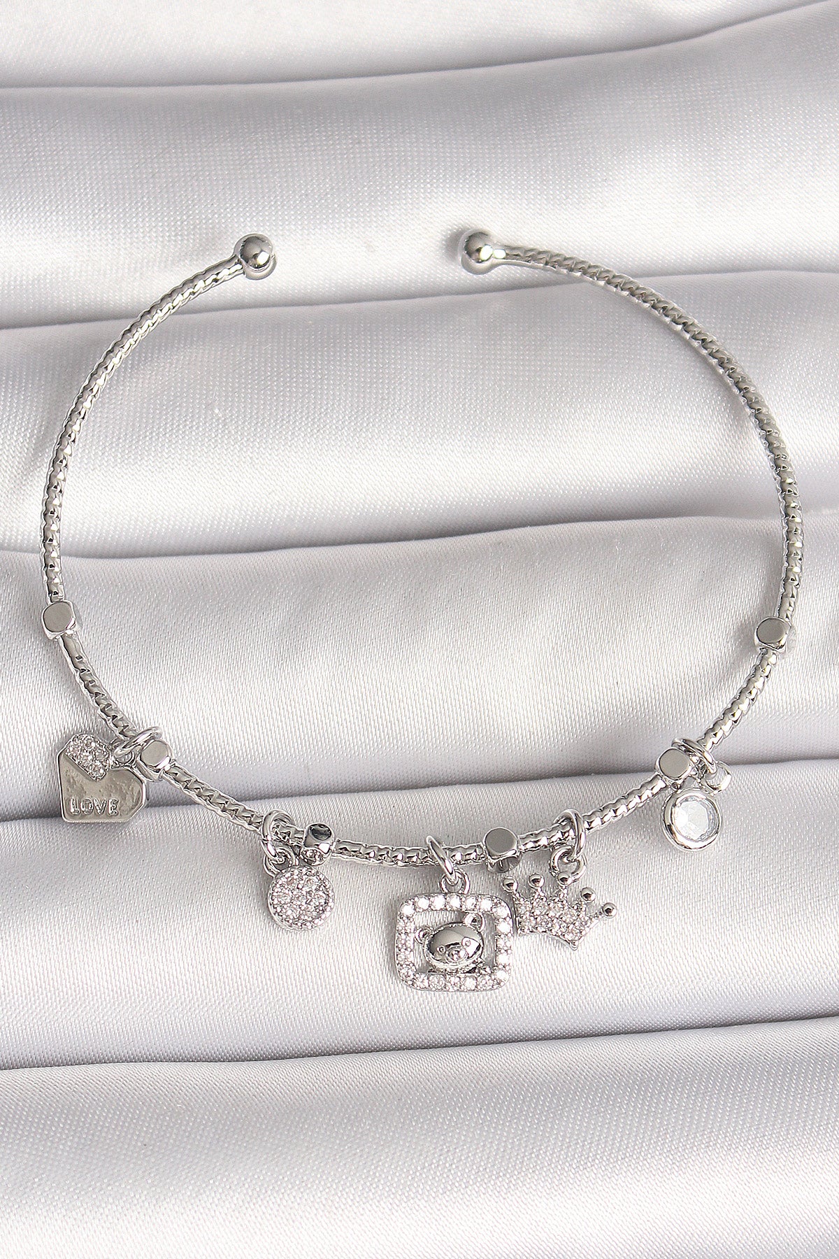 Pirinç Gümüş Renk Sallantı Zirkon Taşlı Ayıcık Figür Taç Detay Charm Kadın Bileklik