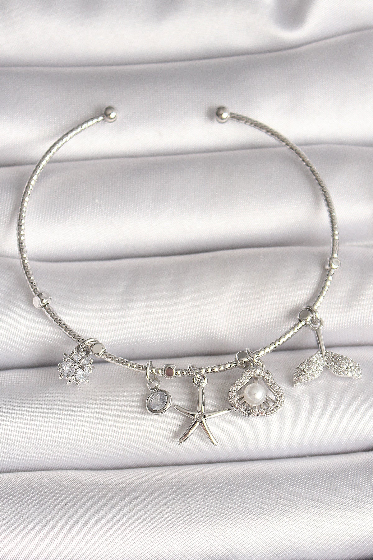 Pirinç Gümüş Renk Sallantı Zirkon Taşlı Deniz Yıldız Figür Balık Kuyruğu Detay Charm Kadın Bileklik