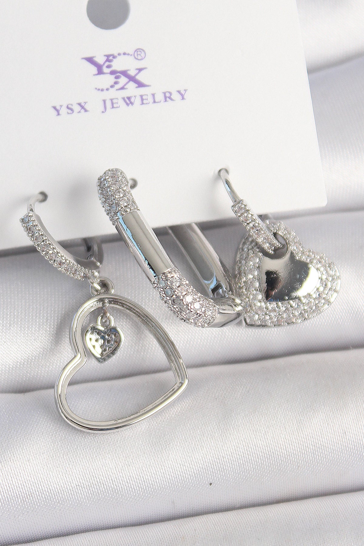 Pirinç Gümüş Renk Sallantı Zirkon Taşlı Kalp Model 3'Lü Kadın Kombin Küpe