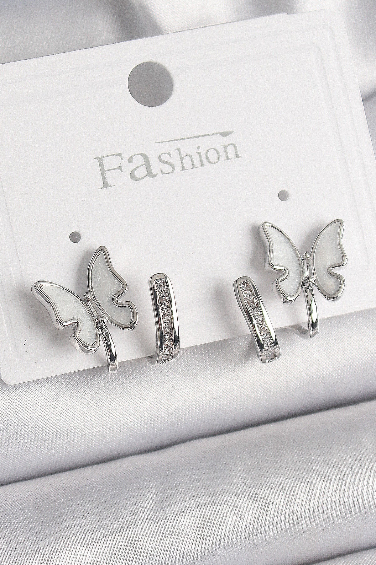 Pirinç Gümüş Renk Zirkon Taş Detaylı Beyaz Sedefli Kelebek Model Kadın Küpe