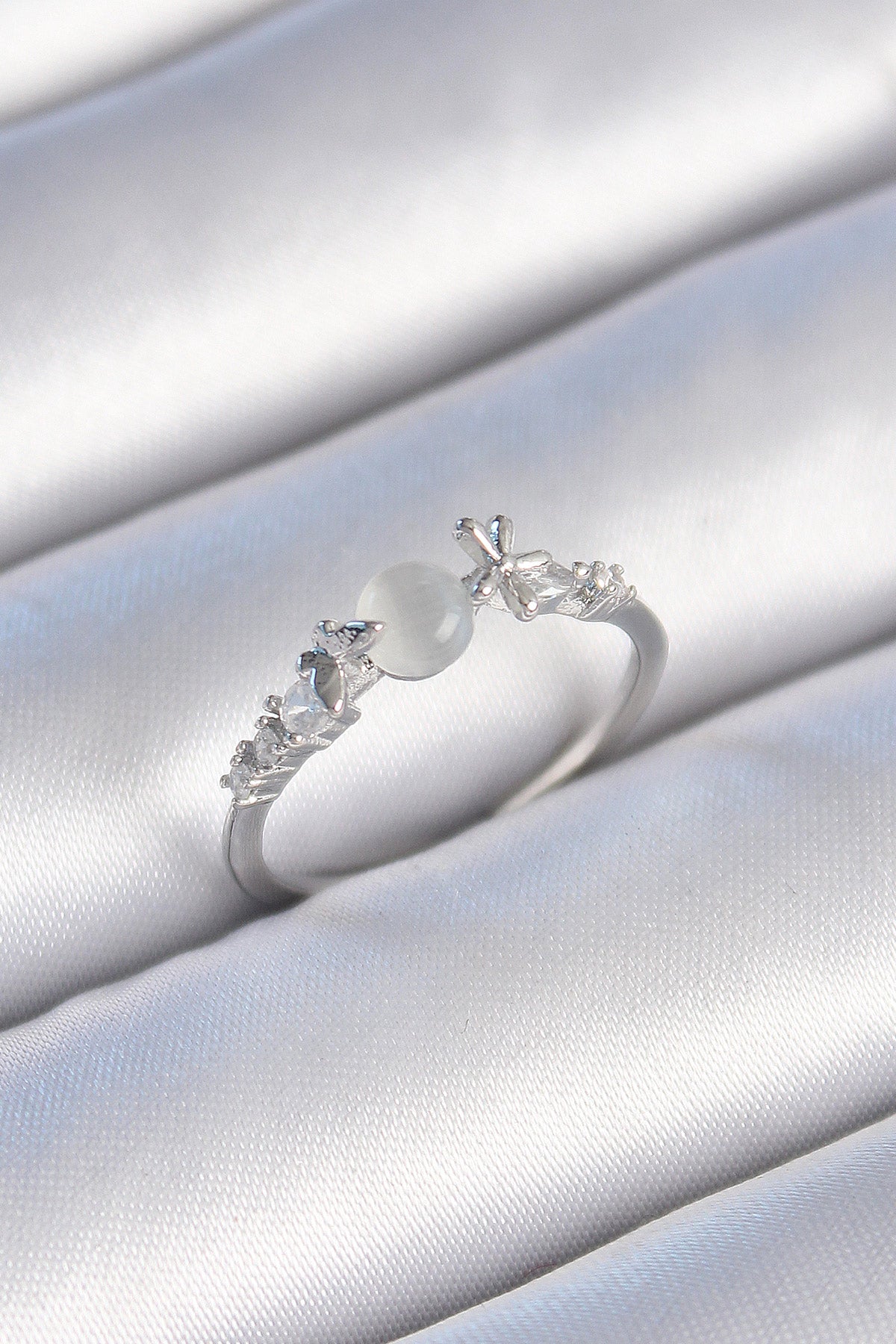 Pirinç Gümüş Renk Zirkon Taşlı Beyaz Mineli Kelebek Detay Kadın Yüzük