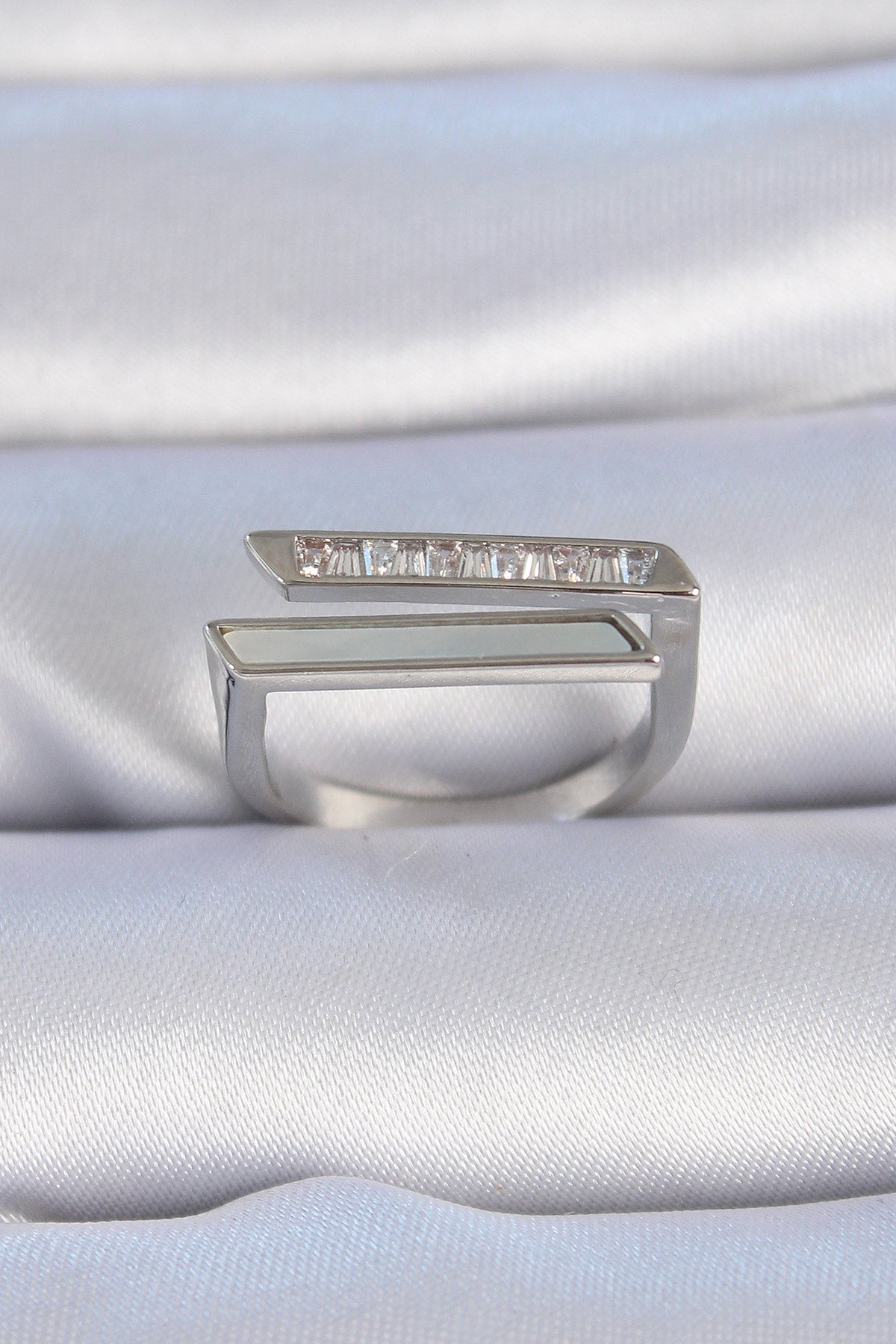 Pirinç Gümüş Renk Zirkon Taşlı Beyaz Sedef Detay Kadın Yüzük