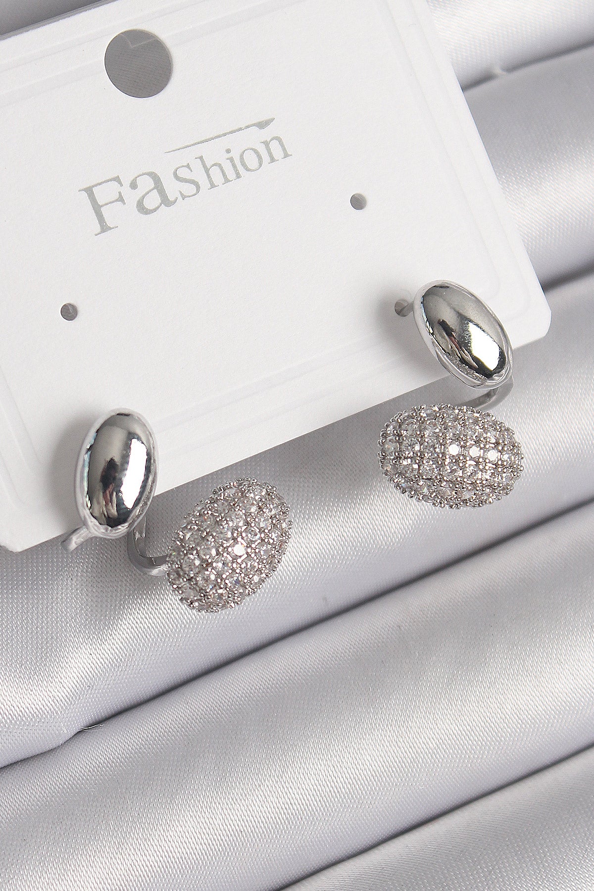 Pirinç Gümüş Renk Zirkon Taşlı Bombeli Model Kadın Küpe