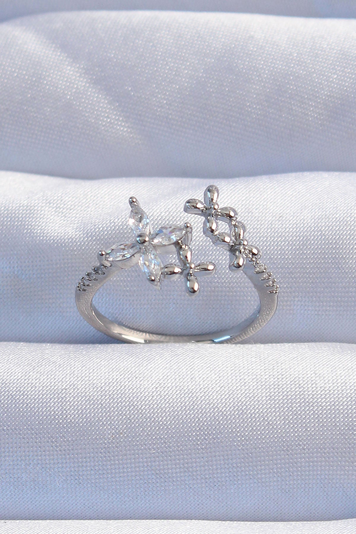 Pirinç Gümüş Renk Zirkon Taşlı Çiçek Model Ayarlanabilir Yüzük