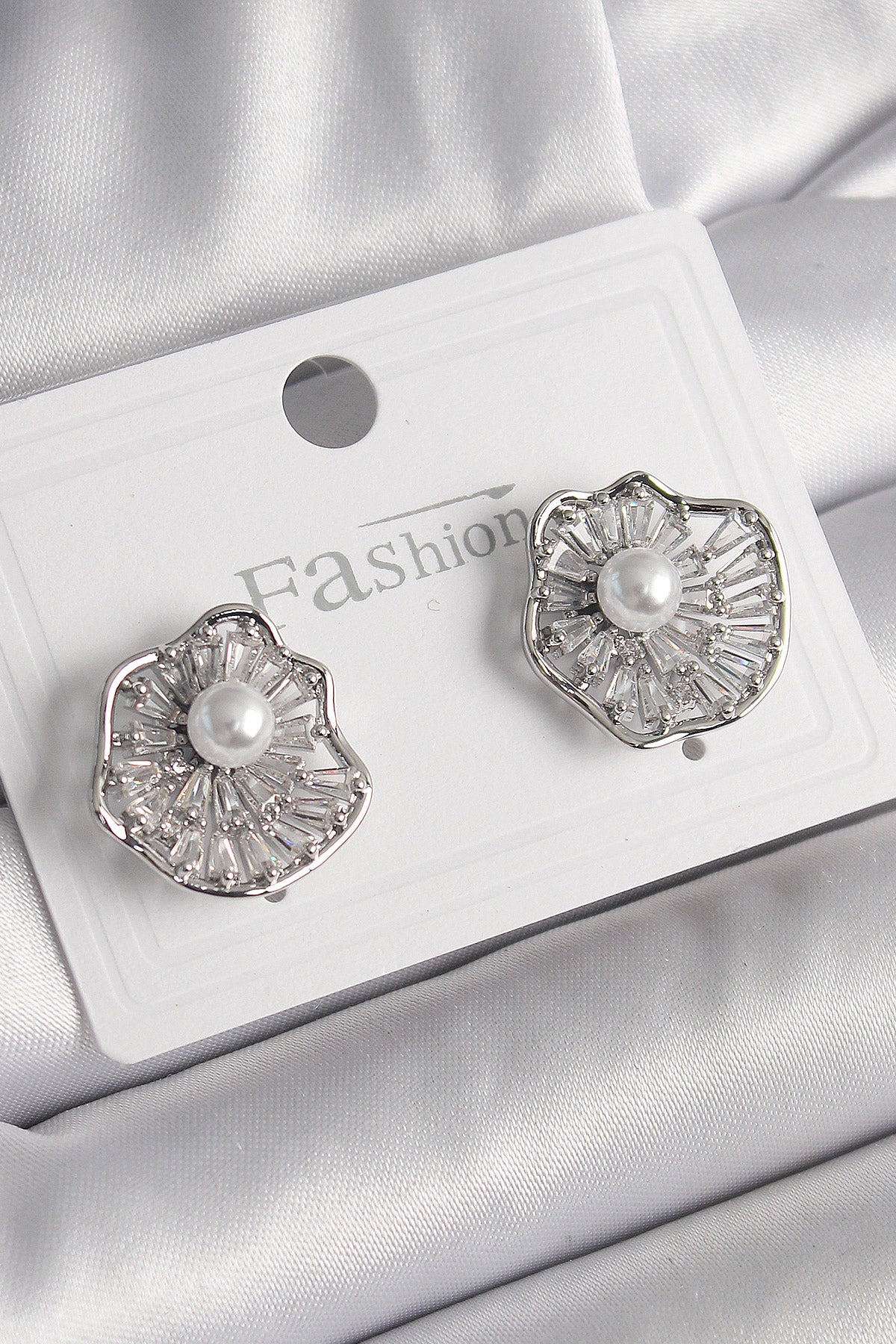 Pirinç Gümüş Renk Zirkon Taşlı Çiçek Model İnci Detay Kadın Küpe