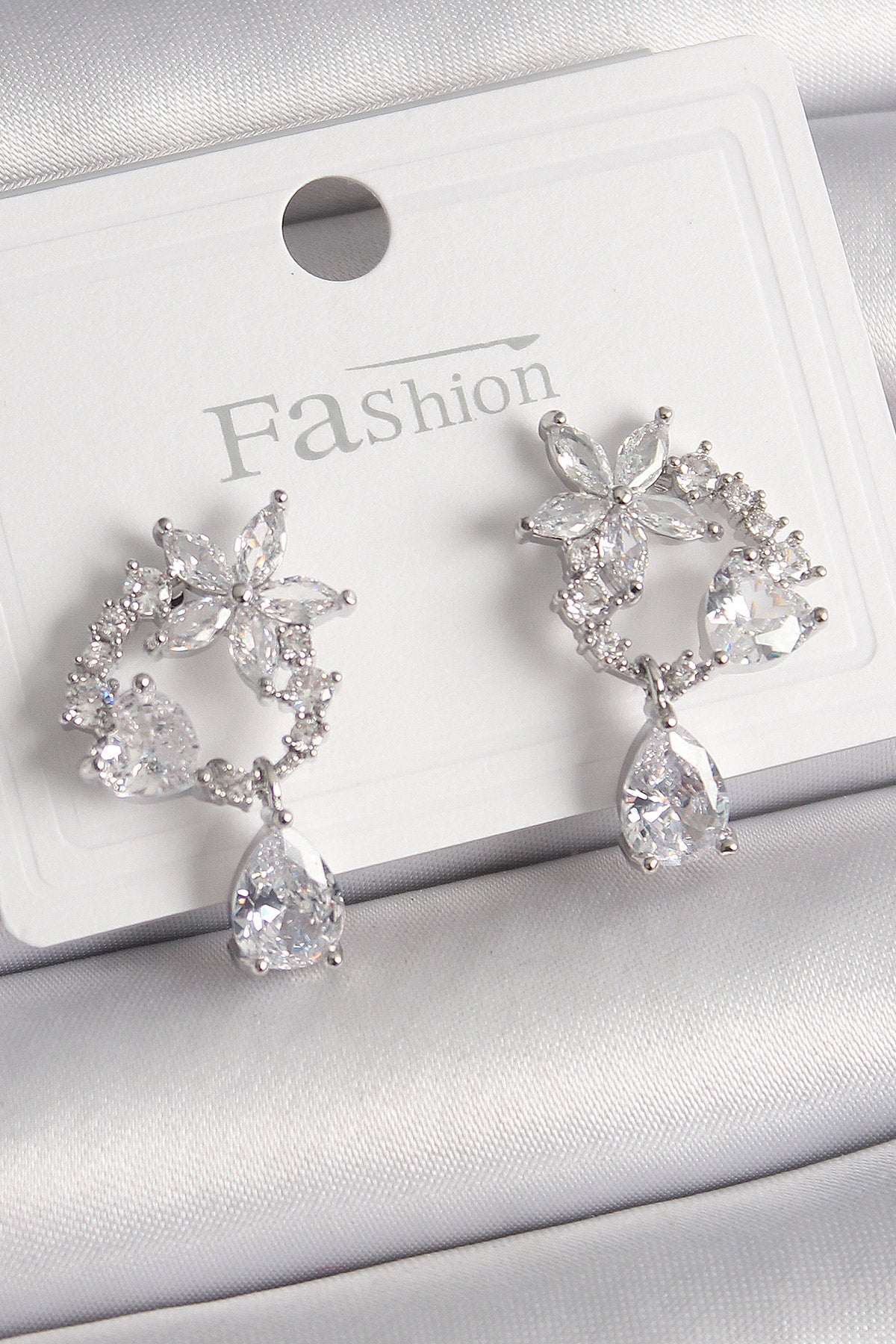 Pirinç Gümüş Renk Zirkon Taşlı Çiçek Model Sallantı Damla Detay Kadın Küpe