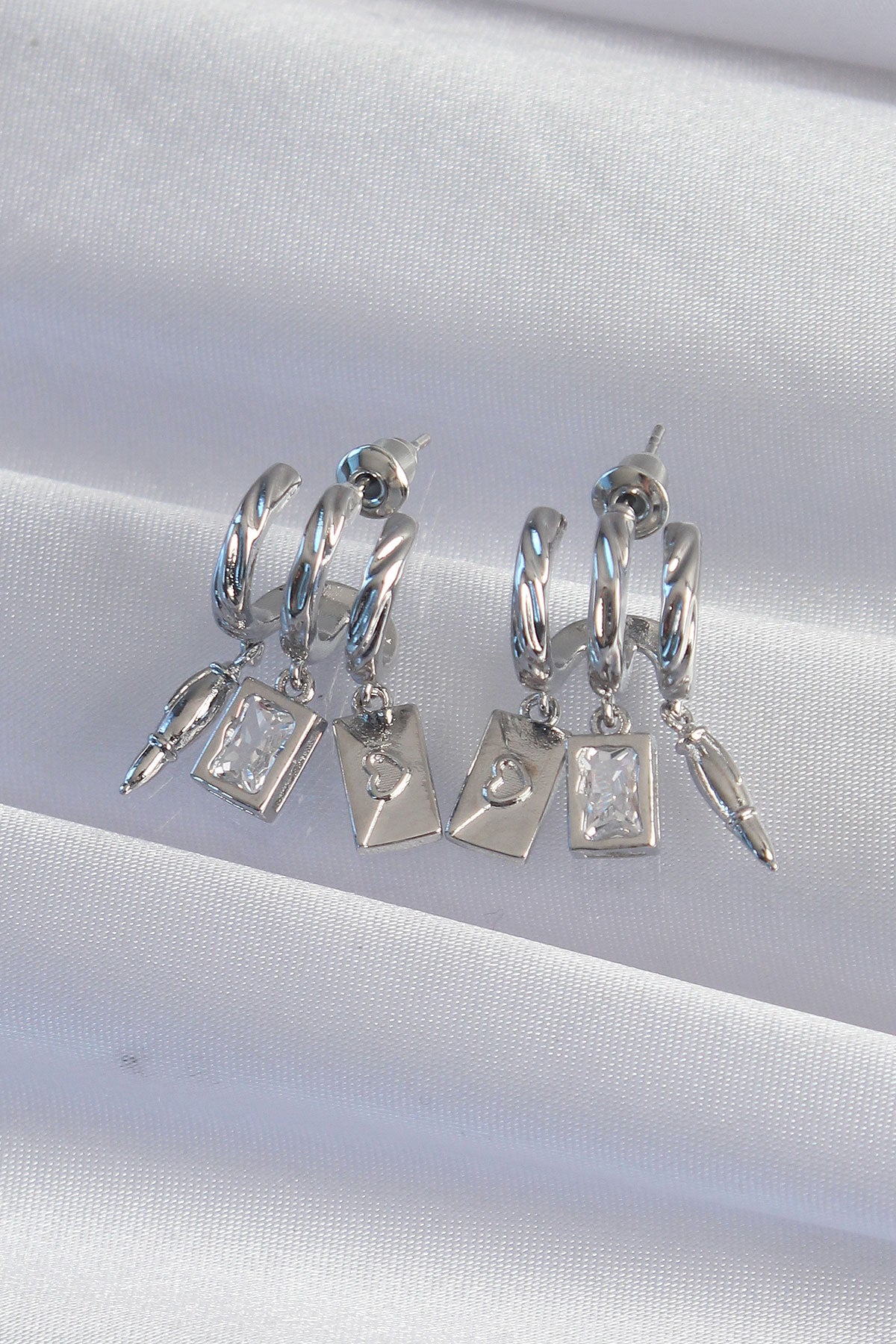 Pirinç Gümüş Renk Zirkon Taşlı Çoklu Aksesuarlı Yarım Halka Kaburga Küpe