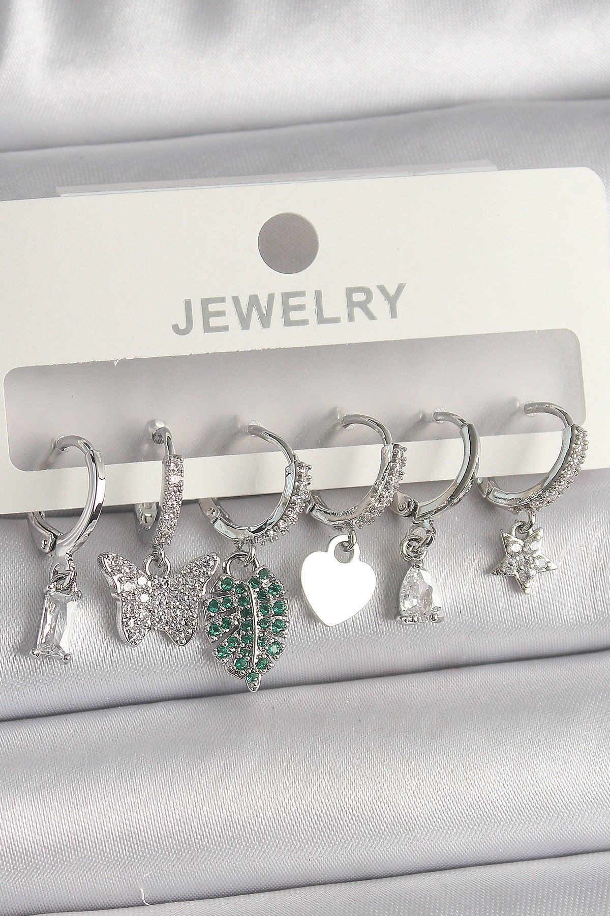 Pirinç Gümüş Renk Zirkon Taşlı Çoklu Figür Kadın Küpe Seti
