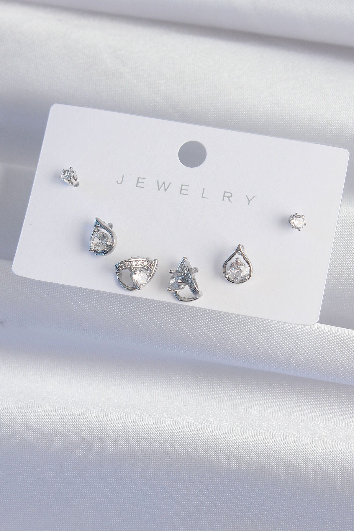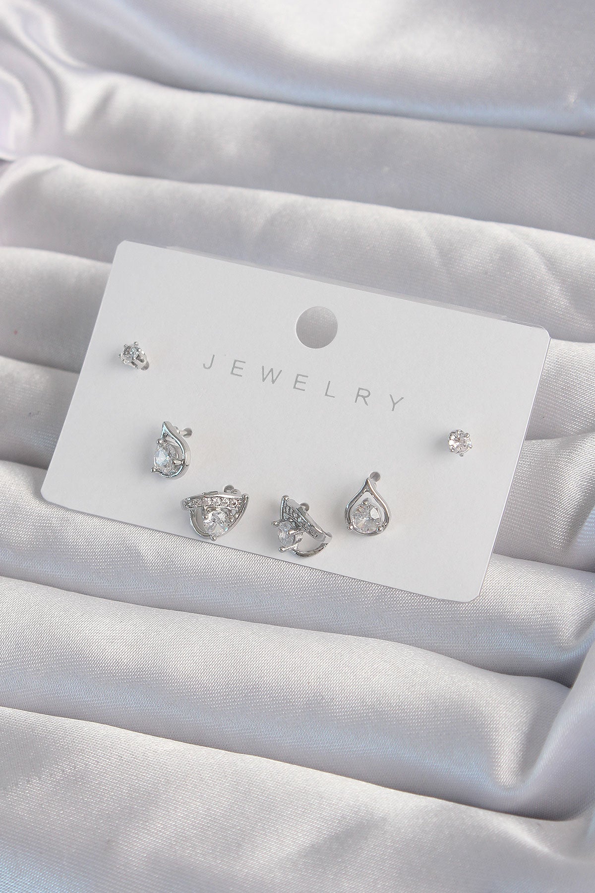 Pirinç Gümüş Renk Zirkon Taşlı Damla Model Küpe Seti