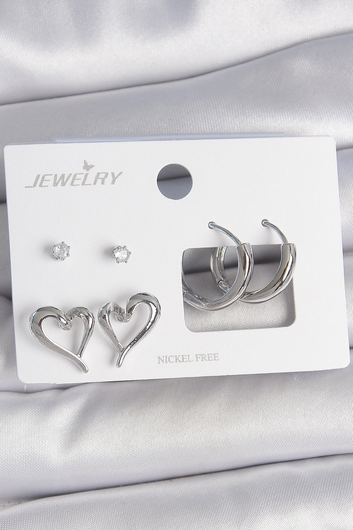 Pirinç Gümüş Renk Zirkon Taşlı Halka Model Kalp Detay 3 Çift Kadın Küpe Seti