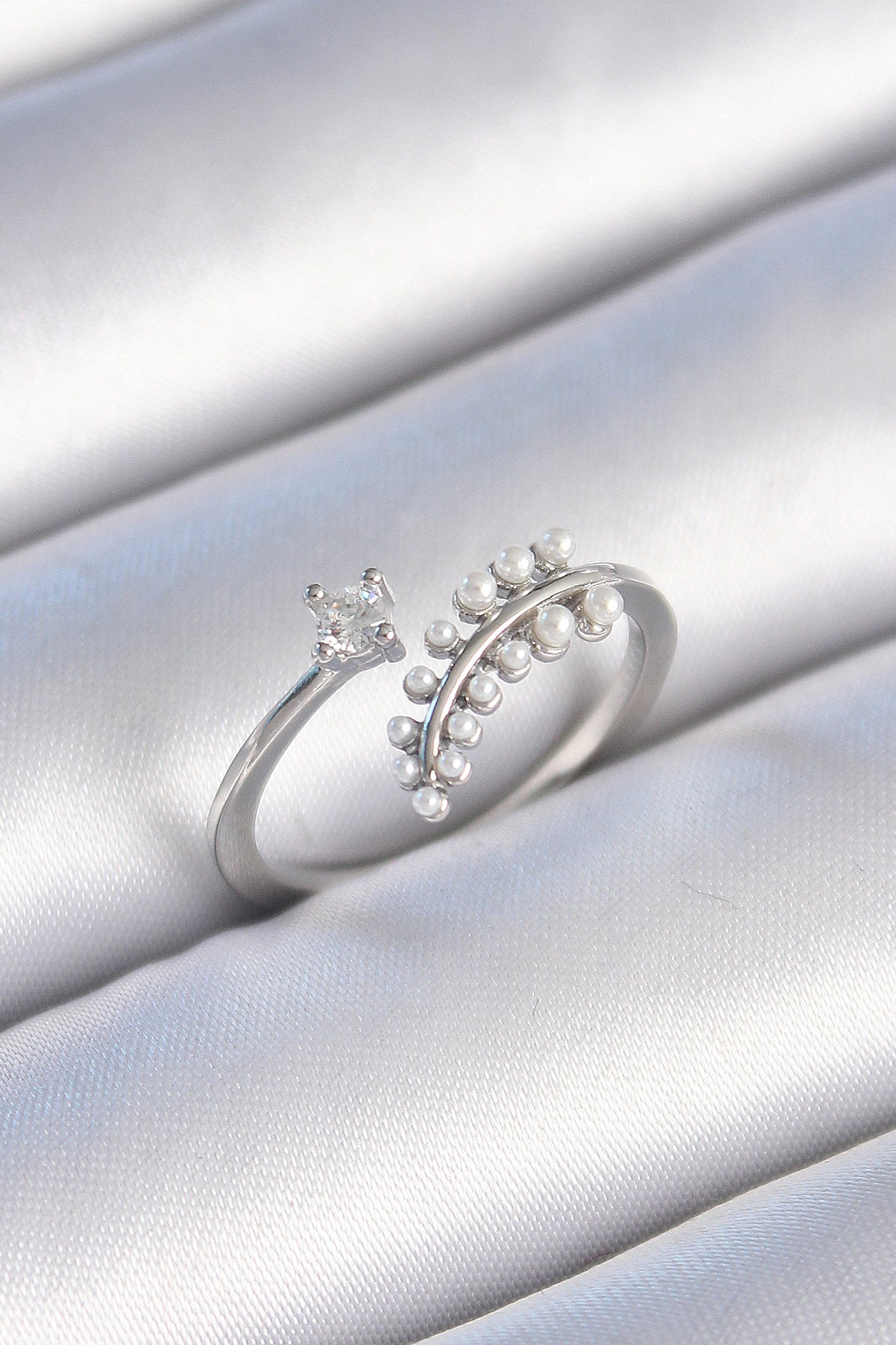 Pirinç Gümüş Renk Zirkon Taşlı İncili Yaprak Model Kadın Yüzük