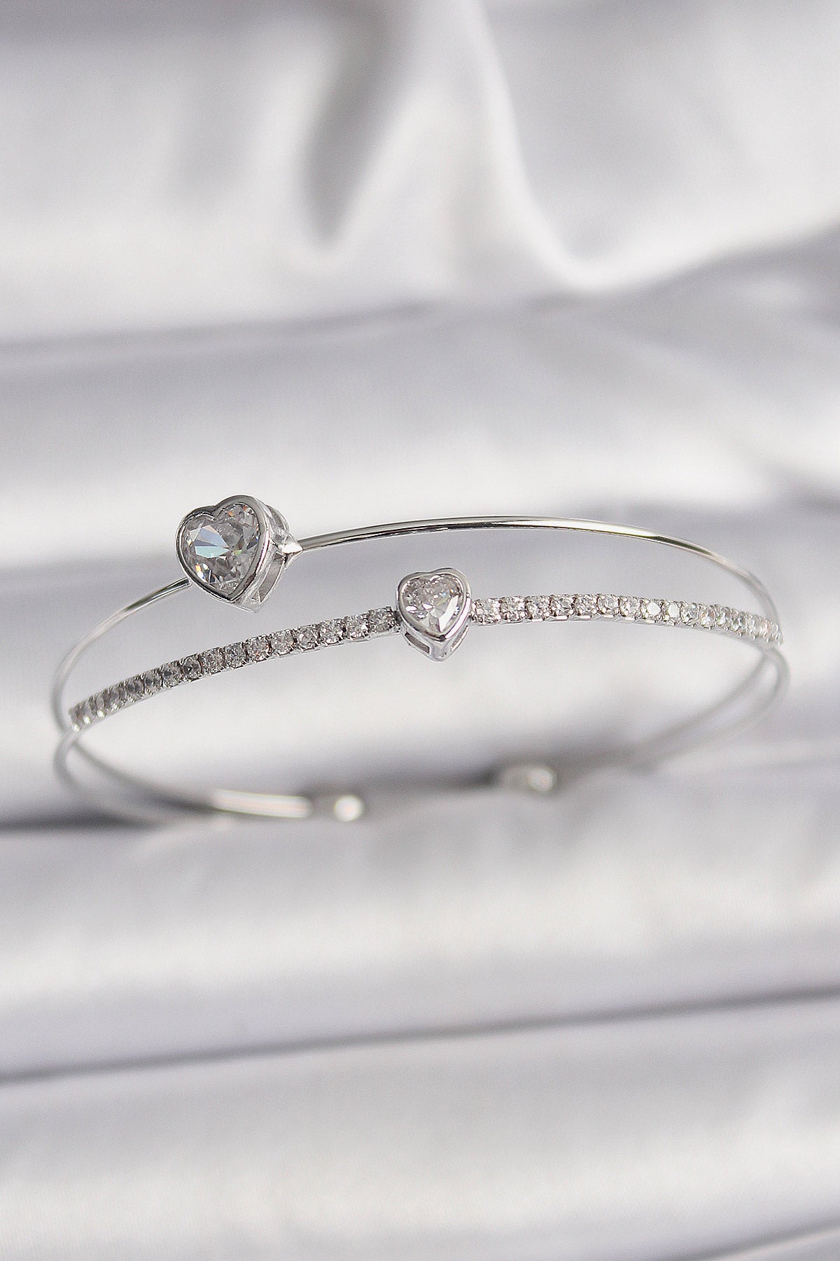 Pirinç Gümüş Renk Zirkon Taşlı Kalp Model Kadın Bileklik