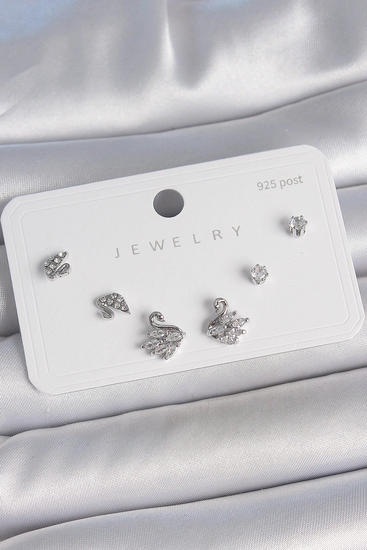 Pirinç Gümüş Renk Zirkon Taşlı Kuğu Model 925 Ayar Gümüş Çivi Kadın Küpe Seti