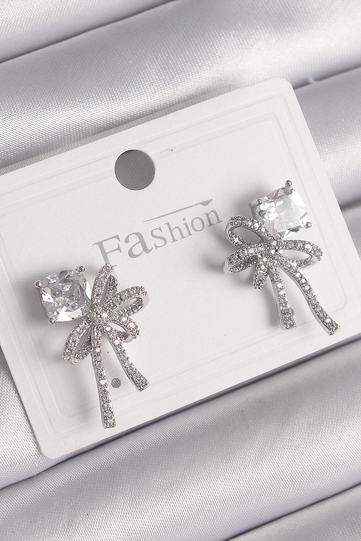 Pirinç Gümüş Renk Zirkon Taşlı Kurdele Model Kadın Küpe